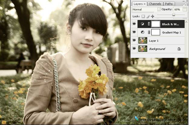 Bước 5: Chỉnh Opacity của Layer Black and White về 60%